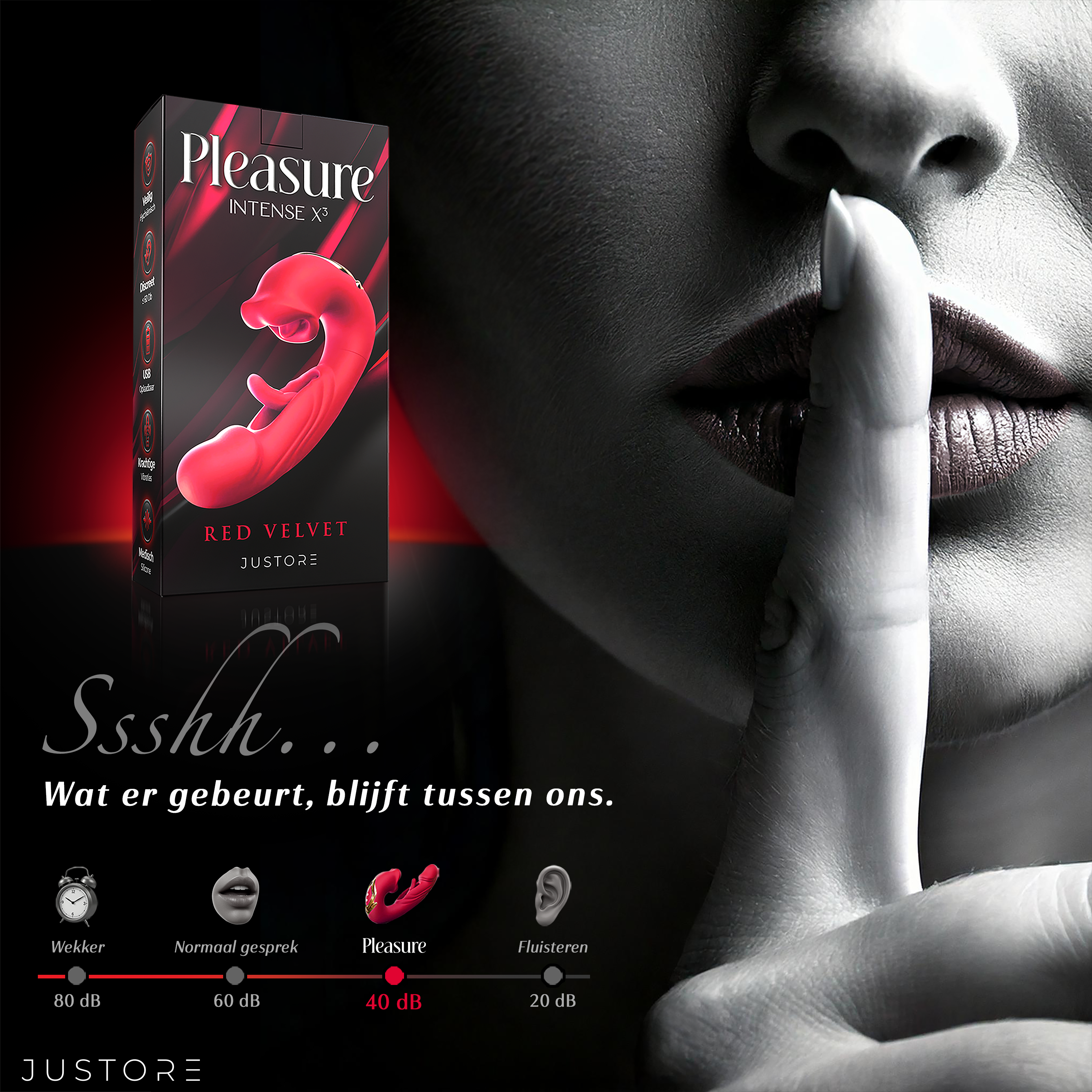 Sensatie komt met geluid, net zoals een sportauto die zijn kracht laat horen. Maar achter een gesloten deur is Pleasure Intense X³ nauwelijks hoorbaar, onder 30 dB — vergelijkbaar met gefluister. Ontdek intense stimulatie in volledige discretie.